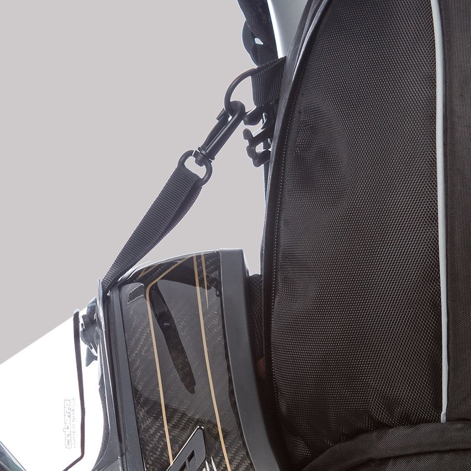 En la parte de delante lleva una red para poder guardar un casco integral, más otro qué se ancla al lateral mediante un enganche especial, pero éste no lo he probado.
