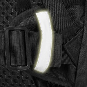 Tiene bandas reflectantes para ser visibles de noche y es impermeable a la lluvia; las cremalleras son grandes y de muy buena calidad, con gomas para facilitar la apertura. La ventilación por la espalda hace su función.